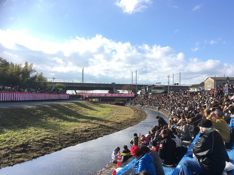 砥崎河原左岸側(上流から下流をみて)に設けた桟敷席から、ゆっくりと妙見祭をご覧いただけます。
